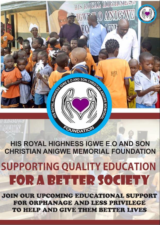 The EOA Foundation was established in 2008 by Christian Chibuko Anigwe. Now known as the His Royal Highness Igwe E.O. And Son Christian Anigwe Memorial Foundation in honour of Mr. Anigwe who passed away June 15, 2020. His wife Irene Anigwe and children have taken over the mission and are committed to upholding the core values and objectives of his Foundation and legacy. The Foundation is a not-for-profit charitable organization and was established with the sole aim of reaching the less privileged in Nigeria